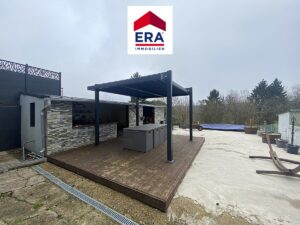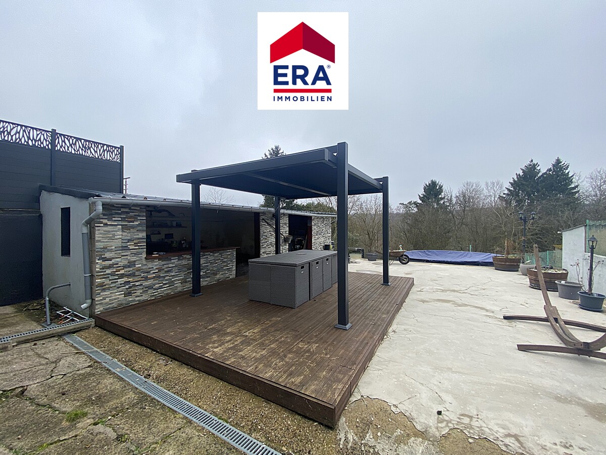 Hinter dem Haus finden Sie die Holzterrasse (Pergola nicht inkl.) mit Sitzbereich, eine überdachte Außenbar und ein Geräteschuppen, diese verfügen über Strom und Wasseranschluss. Im Garten befindet sich ein aufgestellter Pool, die großzügige Grünfläche bietet ausreichend Platz für eine wunderschöne Gartengestaltung.